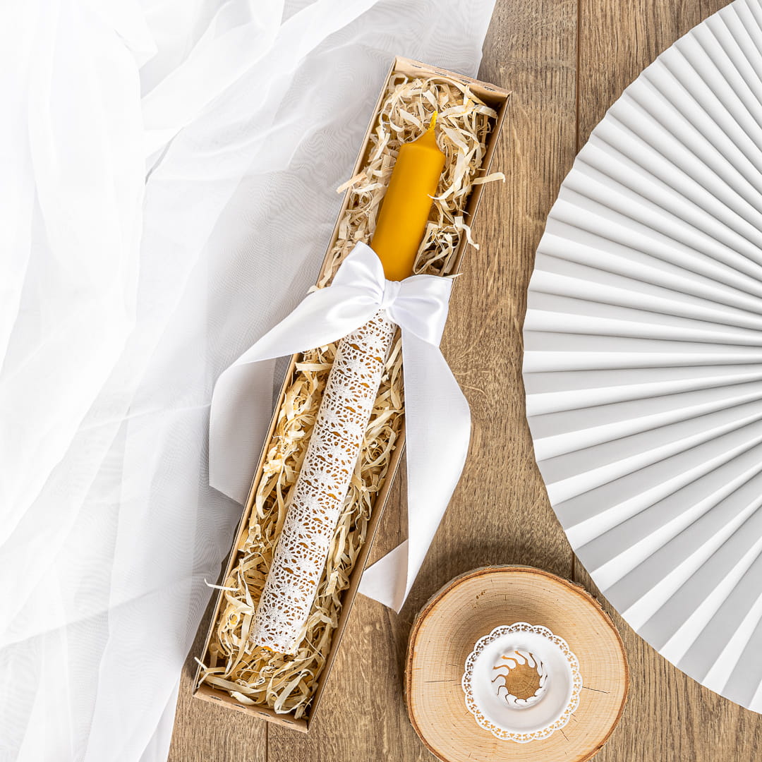 Piękna świeca gromnica z 100% wosku pszczelego do chrztu świętego, ręcznie zdobiona. Przygotowana z dbałością o każdy detal - posiada koronkę w kolorze białym oraz piękną białą satynową kokardkę. Świeca będzie pasować idealnie zarówno na chrzest chłopca jak i dziewczynki. Zdecydowanym atutem jest fakt, iż świeca wykonana jest z naturalnego wosku pszczelego w całości, bez użycia domieszek sztucznych składników. Wosk pochodzi od sprawdzonego polskiego producenta wyrobów pszczelich. Na tę niezwykłą okazję warto jest wyróżnić się, kupując świecę, wykonaną z najwyższej jakości materiałów - będzie to pamiątka na długie lata, wosk pszczeli będzie palił się równomiernym, delikatnym, złotym płomieniem, wydzielając przy tym bardzo przyjemny zapach ula. Do świecy możesz dobrać również (płatne dodatkowo): ozdobne tekturowe pudełko z okienkiem, a także plastikowy okapnik, który ochrania dłonie przed ociekającym woskiem.