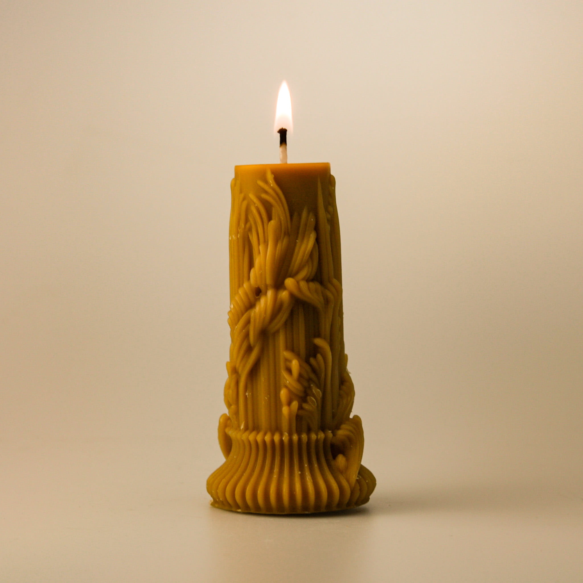 Nasza świeca wykonana jest ze 100% wosku pszczelego. Posiada kształt walca, zwężonego ku górze, po którym "pną się" charakterystyczne wzorki, przypominające pnącza. Świeca niezwykły kształt i z pewnością przypadnie do gustu osobom lubiącym roślinne motywy oraz klimat boho. Naszą świeczkę można podarować komuś bliskiemu jako upominek lub po prostu cieszyć się jej aromatem i wyglądem w zaciszu domowym.