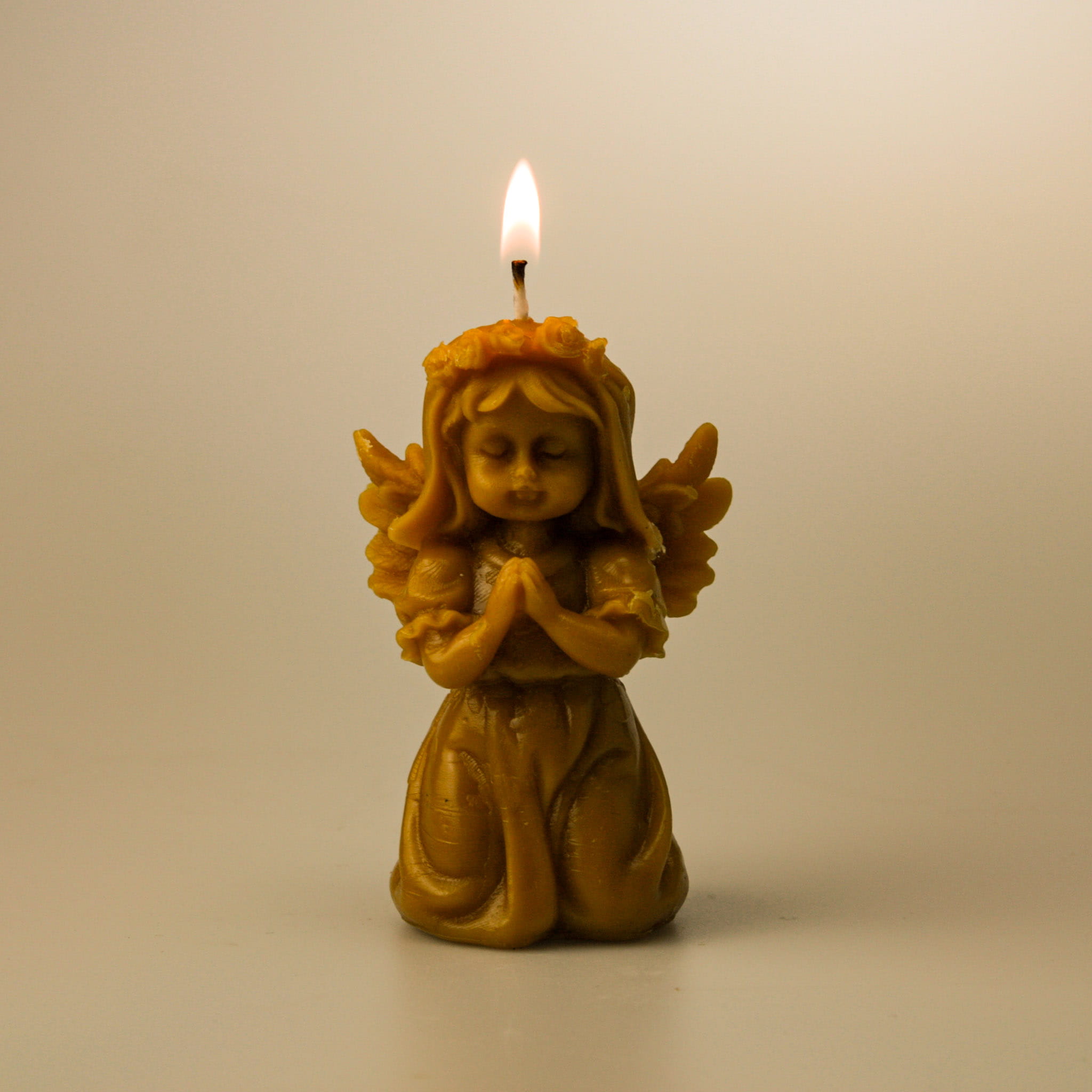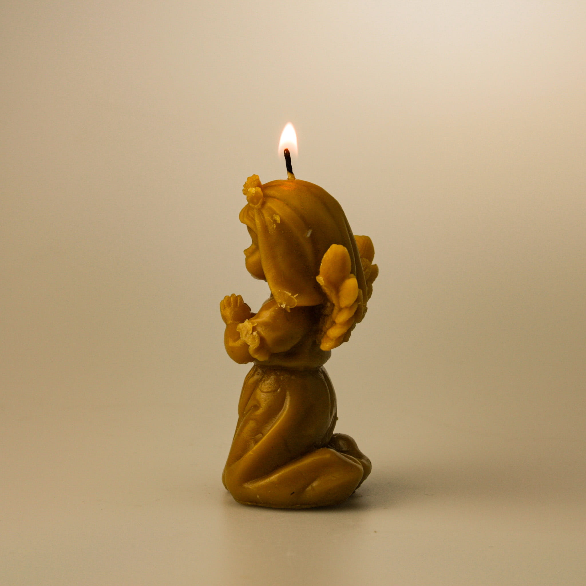 Nasza świeca wykonana jest ze 100% wosku pszczelego. Posiada kształt aniołka płci dziewczęcej. Będzie świetnym upominkiem na święta lub inne ważne okazje, jak komunia święta lub chrzest święty dla dziewczynki.