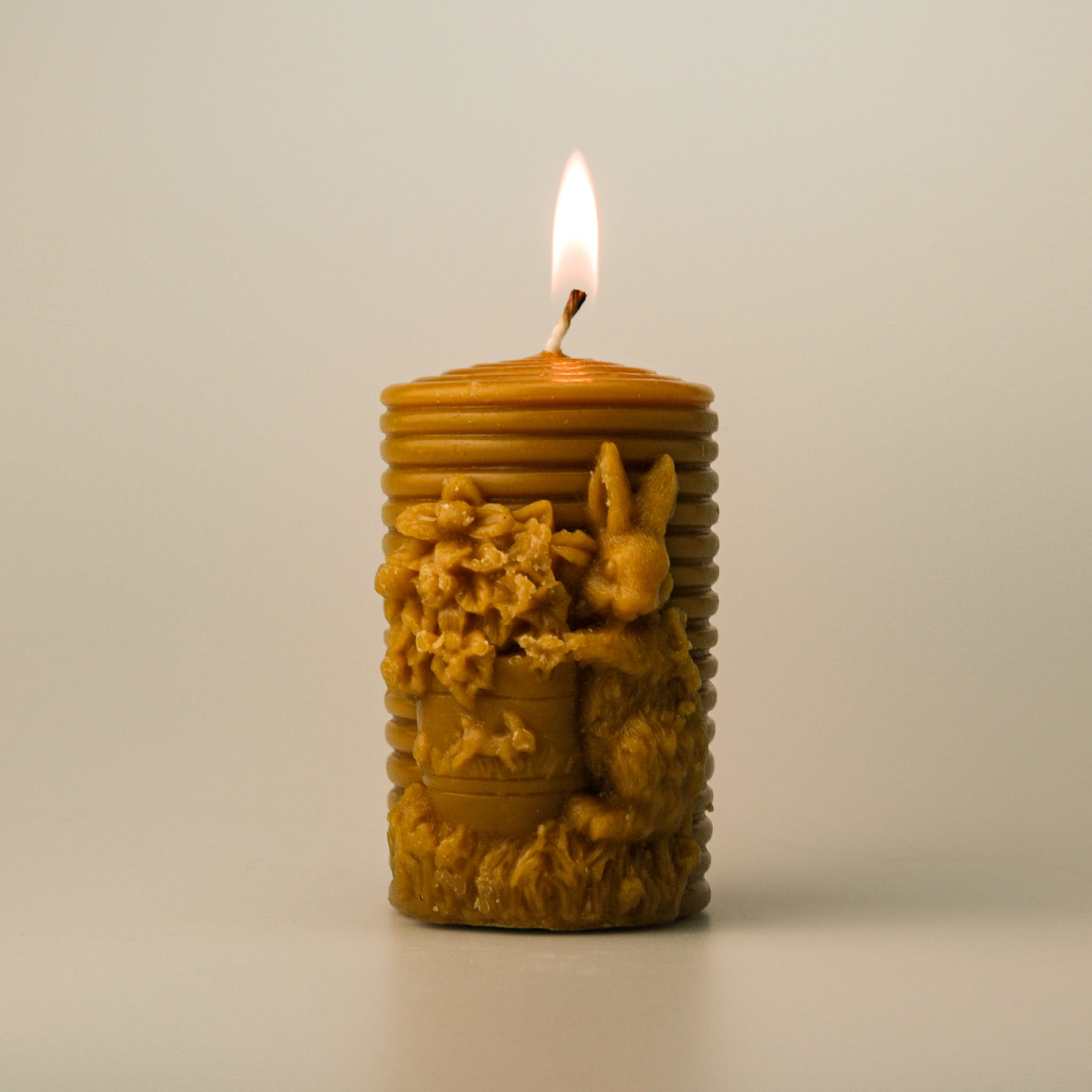 Nasza świeca wykonana jest ze 100% wosku pszczelego. Posiada cylindryczny kształt kojarzący się z ulem, na którym widoczny jest królik wielkanocny, łąka i wszelkiego rodzaju kwiaty. Świeca jest bogata w rozmaite wzory i w niezwykły sposób oddaje klimat świąt wielkanocnych. Można ją podarowac bliskiej osobie jako prezent na święta wielkanocne lub włożyć do koszyka wielkanocnego.